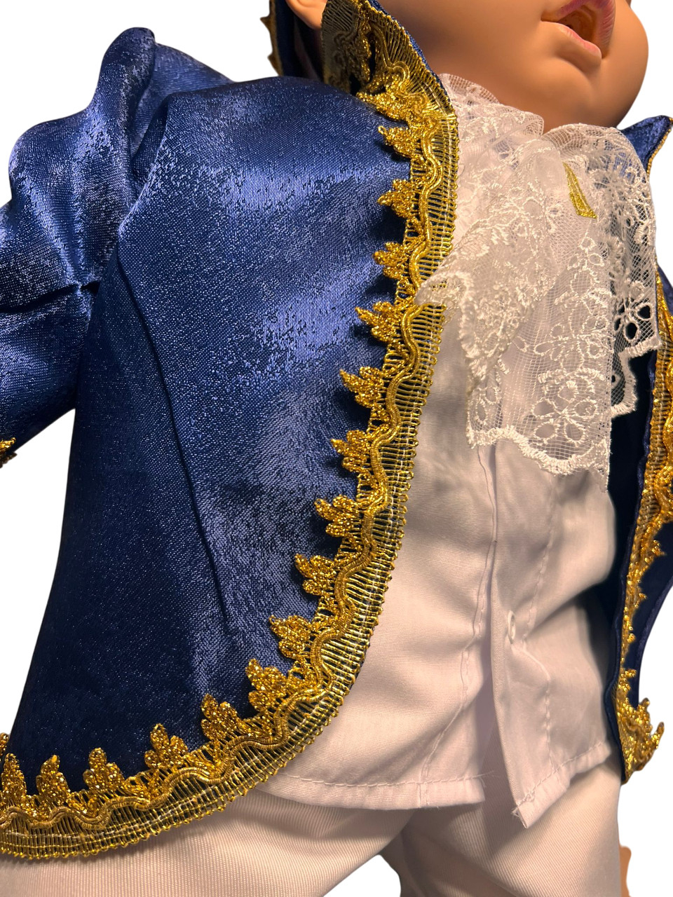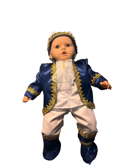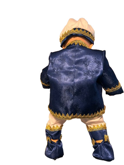 Costumas elegant pentru botezul micutului print. Acest set imbina rafinamentul si confortul folosind materiale de calitate pentru al face pe micut sa straluceasca in ziua botezului. Material moale pentru pielea sensibila a bebelusilor. Costumul cuprinde: pantalonas din bumbac , camasa din bumbac , sacou din catifea ,cizmulite din catifea si bascuta. Produs realizat in Romania.