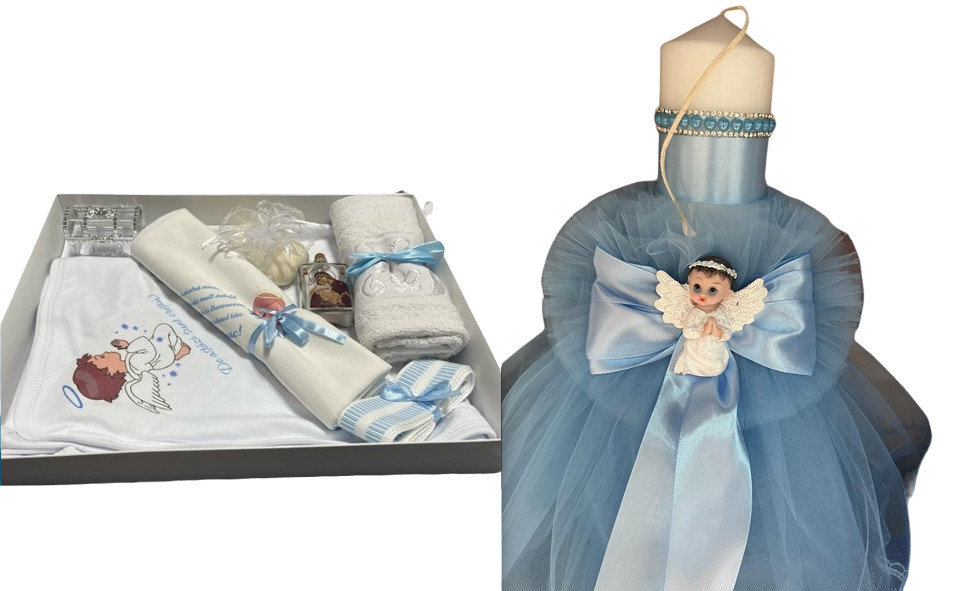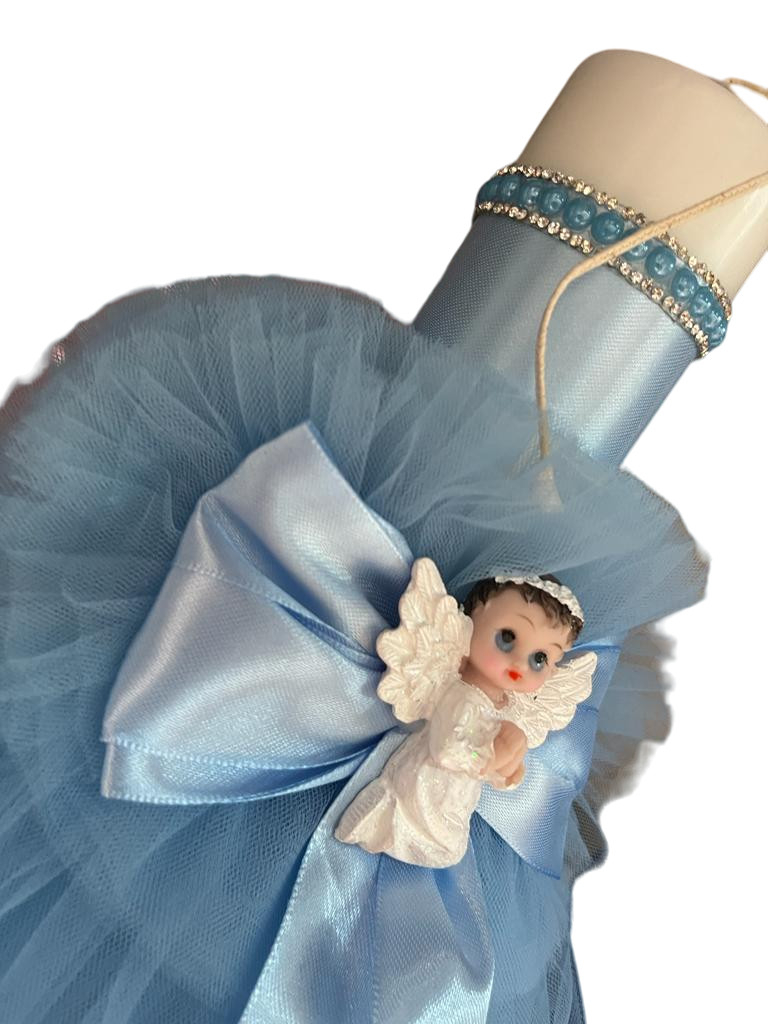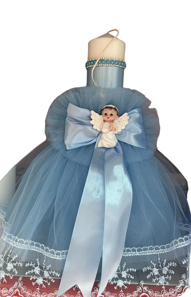 LUMANARE BOTEZ HANDMADE - LUNGIME 35 CM Decorul este din voal de culoare albastru cu tulluri. Lumanarea este accesorizata cu ingeras cu funda aplicat, strasuri atasate in partea superioara. Lumanarea este produsa manual in Romania. Toate componentele sunt realizate in atelierul propriu, din bumbac de cea mai buna calitate: 100%BBC Trusoul include: -PANZA MIR -FASA MIR -PROSOP PREOT -PROSOP BEBE UMBAC CU CAPISON -STICLUTA MIR -SAPUN PREOT -CUTIE -CUFAR PRIMA SUVITA PRODUS IN ROMANIA