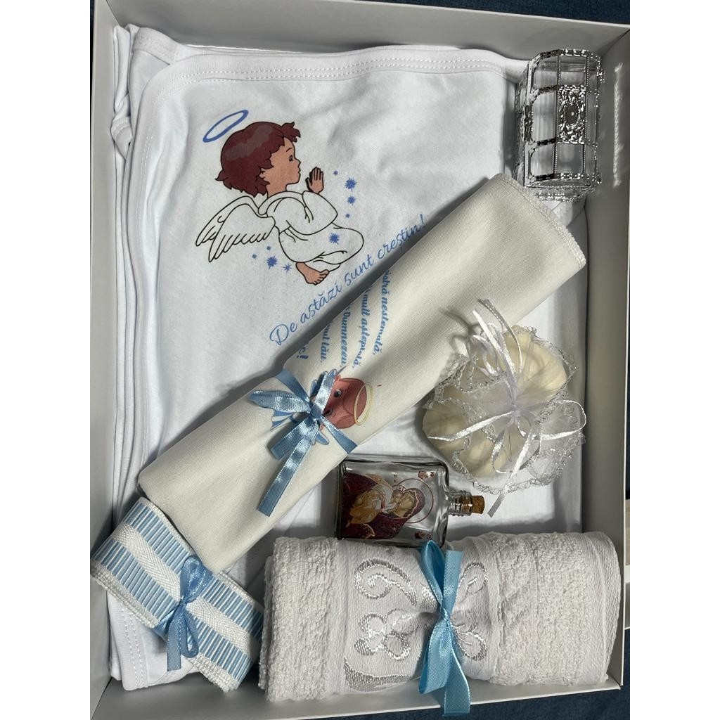 Set botez baieti, ingeras, culoare alb/albastru deschis, 9 piese