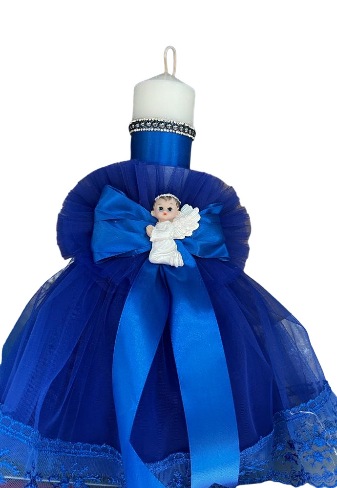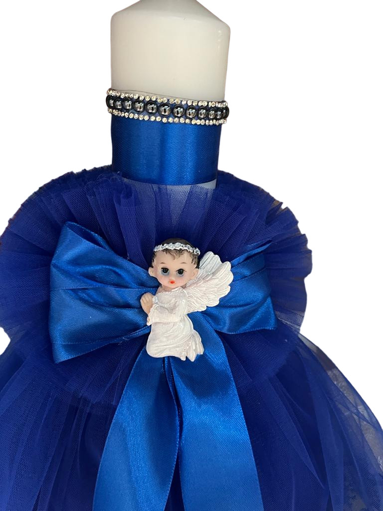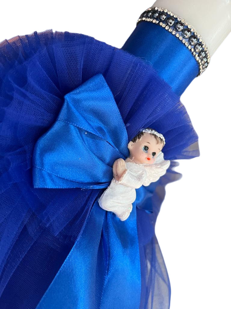 LUMANARE BOTEZ HANDMADE - LUNGIME 35 CM Decorul este din voal de culoare albastru inchis cu tulluri. Lumanarea este accesorizata cu ingeras cu funda aplicat, strasuri atasate in partea superioara. Lumanarea este produsa manual in Romania. Toate componentele sunt realizate in atelierul propriu, din bumbac de cea mai buna calitate: 100%BBC Trusoul include: -PANZA MIR -FASA MIR -PROSOP PREOT -PROSOP BEBE UMBAC CU CAPISON -STICLUTA MIR -SAPUN PREOT -CUTIE -CUFAR PRIMA SUVITA PRODUS IN ROMANIA