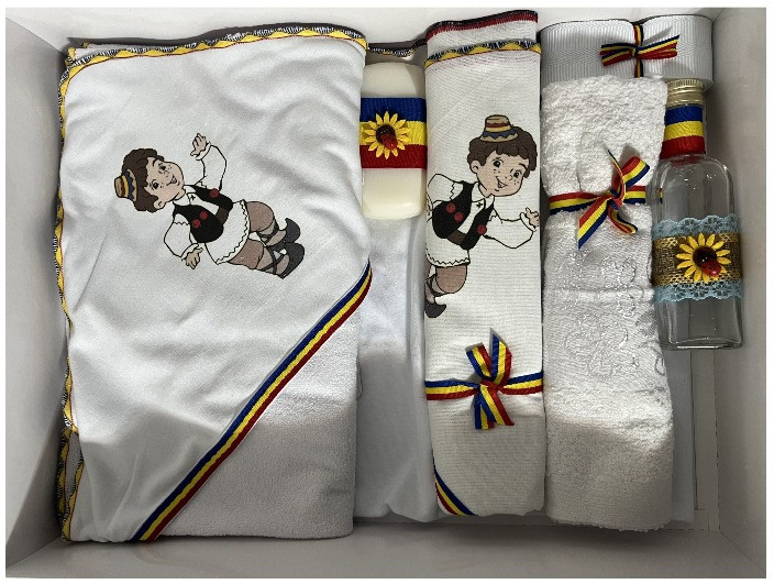 SET BOTEZ: Costum popular de culoare alba, cu motive traditionale , alcatuit din 6 piese: camasa, brau popular,opincute,vesta ,pantaloni,clop. Camasa alba cu motive traditionale este confectionata din bumbac. De asemenea vesta, poate fi purtata si in combinatie cu alte haine. Costumul popular poate fi purtat la orice ocazie speciala cum ar fi botez, serbare, Zi Nationala etc. Trusou traditional de culoare alba cu tarancuta brodata, alcatuit din 8 piese. Trusoul include: - LUMANARE TRADITIONALA -PANZA MIR -FASA -PROSOP PREOT -PROSOP BEBE -STICLUTA MIR -SAPUN PREOT -PATURICA BUMBAC Produs realizat in Romania.